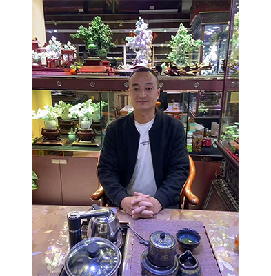擅长精雕各种翡翠挂饰、摆件,以人物、山水、动物花鸟题材为主,在立体雕、镂空雕、浮雕等雕刻技艺上有自己独特的见解与方法。